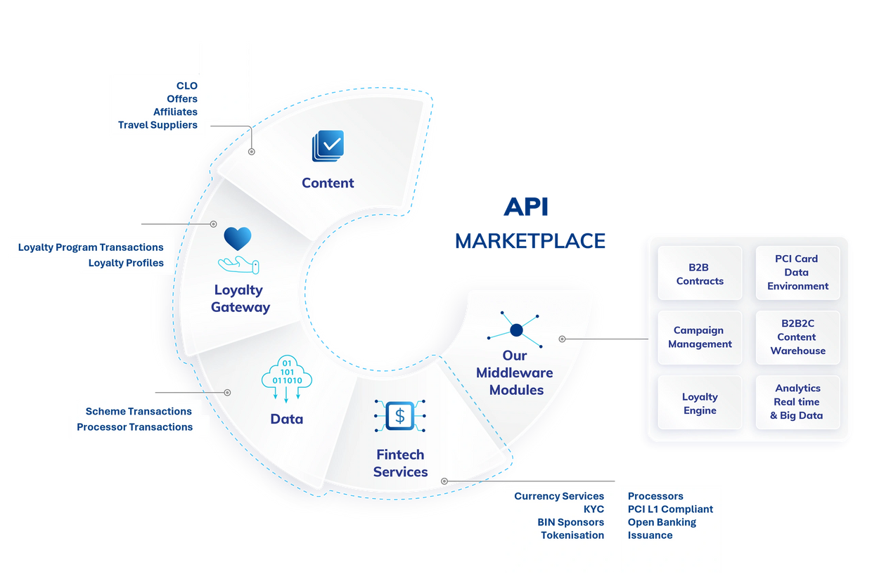 The digital transformation process is simplified via our suite of API's that rebundles a wide range of FinTech, loyalty, commerce, analytics & payments features in an entirely re imagined single financial stack. This facilitates interaction with a wide number of participants delivering a range of capabilities.